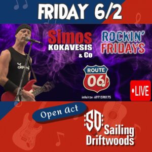 Την Παρασκευή 6 Φεβρουαρίου, στις 22:00, το Route 06 υποδέχεται , παρέα με τον μοναδικό Σίμο Κοκαβέση ένα από τα πιο δυναμικά ελληνικά cover group τους Sailing Driftwoods!