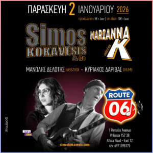 Την Παρασκευή 2 Ιανουαρίου, στις 22:00, το Route 06 υποδέχεται έναν από τους σημαντικότερους Έλληνες κιθαρίστες της blues-rock σκηνής — τον μοναδικό Σίμο Κοκαβέση μαζί με την εκπληκτική κόρη του Μαριάννα!